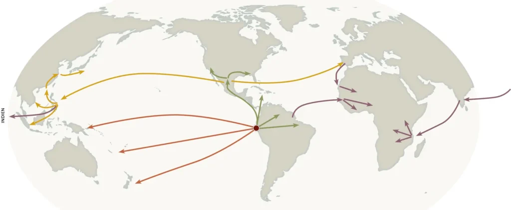 Sötpotatis har troligtvis odlats i minst 5 000 år. Den spreds och blev basföda över de tropiska delarna av Amerika upp till norra Mexiko.